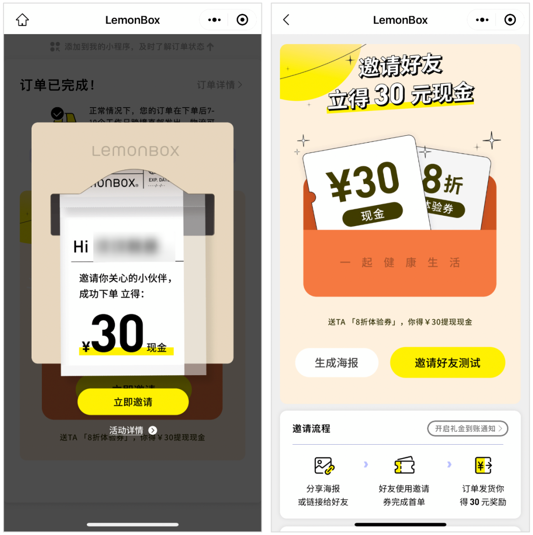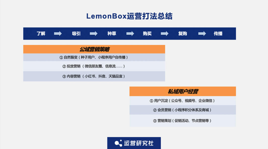 基于這種思路,LemonBox 可以說是微信生態(tài)里的深度玩家,共建立了公眾號、視頻號、企業(yè)微信、搜一搜在內(nèi)的 15 個觸點,不僅有「公域場」的營銷策略,還在「私域場」深耕用戶/會員運營。通過與創(chuàng)始團隊交流,并結(jié)合運營社的運營研究模型,我們發(fā)現(xiàn) LemonBox 在不同的階段,有不同的營銷及運營重點,從而將產(chǎn)品打爆。如下圖所示:接下來,我們來一一拆解一下 LemonBox 的運營動作。在了解、吸引、種草、購買這個階段,LemonBox 側(cè)重「公域營銷策略」,以微信平臺為主,抖音、小紅書等其他平臺為輔。創(chuàng)始人 Derek 向運營社介紹到,早期 LemonBox 靠著周圍人轉(zhuǎn)介紹,搞拉新補貼,做口碑和裂變,獲得了最早一批種子用戶。在 LemonBox 小程序頁面,我們能看到,有多個「邀請好友」的提示,靠「現(xiàn)金返現(xiàn)」促使用戶分享裂變。資料顯示,LemonBox 在最初上線 6 周的時間里,就獲得了 6 萬美金的收益,每周增長 35%。隨后,LemonBox 向更大的目標人群邁進,主攻一二線城市的都市白領(lǐng),做進一步擴圈。在公域場獲客,做投放自然是少不了。通過踩坑、測試,運營團隊得出來一個高 ROI,性價比更優(yōu)的投放選擇。“像抖音、天貓更多是品牌形象店,類似于品牌在線下的一個 Pop-up store(快閃店),我們做的就是線上的 Pop-up store,不做貨架,只做品宣。所以,在這些平臺把內(nèi)容聲量做起來,看重曝光。至于成交,我們還是會回到騰訊的生態(tài),將信息流廣告、朋友圈等作為一個渠道去看待,并將流量在這個渠道和生態(tài)里做扭轉(zhuǎn)?!?/span>