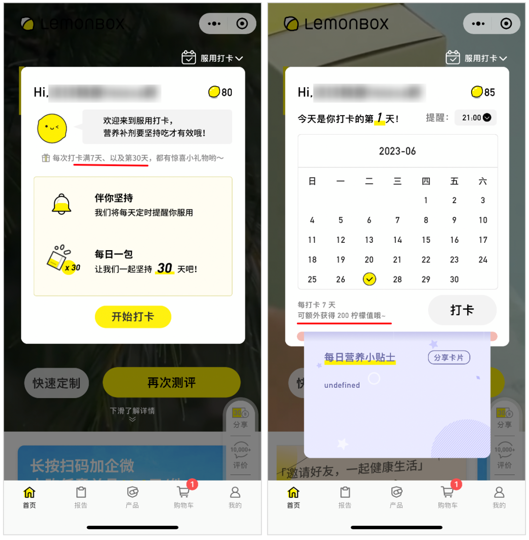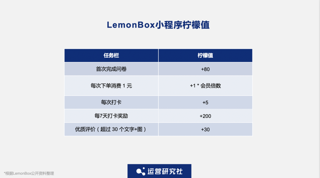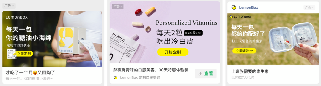 簡單來說,LemonBox 在小紅書、抖音、天貓做品宣,借「內(nèi)容營銷」來吸引用戶并向其種草;在微信生態(tài)做效果,通過「投放營銷」來提高獲客效率。具體而言,LemonBox 在微信朋友圈、公眾號信息流廣告,或者文章底部等廣告位做小程序投放,通過不同的內(nèi)容素材做觸達。廣告素材中,有向老用戶強調(diào)「復(fù)購」:“才吃了一個月,又回購了!”,有強調(diào)「效果」的:“口服美容,吃出冷白皮”;有強調(diào)「福利優(yōu)惠」的:“30 天特惠體驗裝”;有強調(diào)「人群」的:“打工人需要的維生素”。投放鏈路上,品牌通過朋友圈廣告,引導(dǎo)用戶至小程序評測轉(zhuǎn)化,然后將用戶沉淀到私域用戶池(公眾號、視頻號、企業(yè)微信),為后續(xù)觸達和服務(wù)做鋪墊。伴隨著 AI 的爆火,LemonBox 也借 AIGC 提高投放的 ROI,降本增效,賦能品牌運營。(這部分會后面的 03 部分展開講解)2)品牌私域陣地,做用戶沉淀和持續(xù)轉(zhuǎn)化有了流量以后,如何讓用戶在小程序上購買,并持續(xù)復(fù)購,是品牌營收增長的另一個重點。LemonBox 客單價在 500 元左右,屬于在該品類中高的定價,能夠做到季度復(fù)購率 30%,LemonBox 在私域用戶運營上花了些功夫。私域流量鏈路上,LemonBox 主要將用戶先引導(dǎo)至小程序,再通過小程序沉淀到自己的公眾號、視頻號和企業(yè)微信。在產(chǎn)品包裝上,也有引導(dǎo)至公眾號、企業(yè)微信二維碼的物料。公眾號和視頻號上,品牌主要是通過輸出「內(nèi)容」做留存,持續(xù)向用戶輸出維生素相關(guān)的科普性質(zhì)內(nèi)容;在小程序上,LemonBox 設(shè)置了服用定制營養(yǎng)包提醒,并進行打卡活動,每個 7 天就有積分獎勵。運營社在翻看用戶評價中,常能看到“已堅持了 xxx 天”“真的能堅持服用”的評語。某種程度上,LemonBox 在培養(yǎng)和監(jiān)督用戶形成一個習(xí)慣。如果在使用產(chǎn)品期間有任何問題,還可以添加企業(yè)微信,咨詢「健康伙伴小維」或者「超級營養(yǎng)伙伴 Bella」。企業(yè)微信上,LemonBox 主要是向用戶提供 1v1 的營養(yǎng)指導(dǎo),及真人售后服務(wù)。運營社觀察到,這個超級營養(yǎng)伙伴,并不會在日常中發(fā)廣告打擾用戶,而是用戶主動問詢后才會做回復(fù)。上述這些一系列的設(shè)計和動作,其實都是 LemonBox 在微信的核心觸點上,靠“服務(wù)”做多次觸達,從而讓用戶復(fù)訪小程序,提高復(fù)購率。LemonBox 搭建了一個比較完善的會員積分體系,并以「檸檬值」做呈現(xiàn)。越高的會員等級會給到用戶更多權(quán)益,以此提高用戶忠誠度和復(fù)購率。