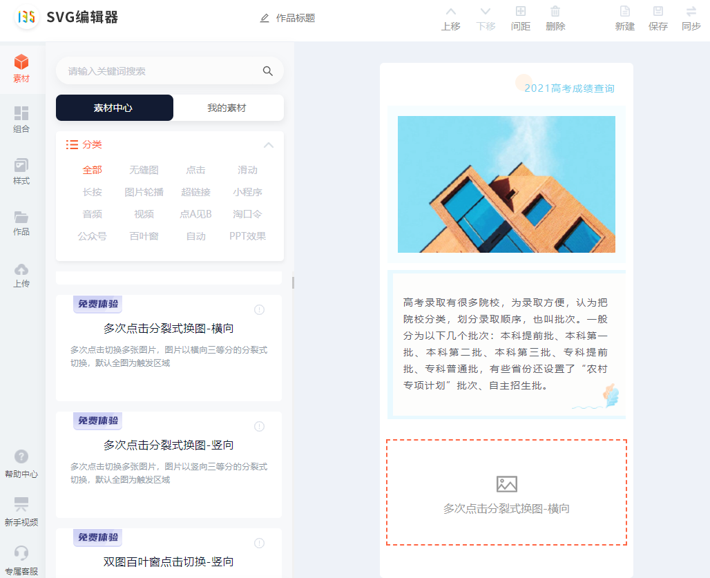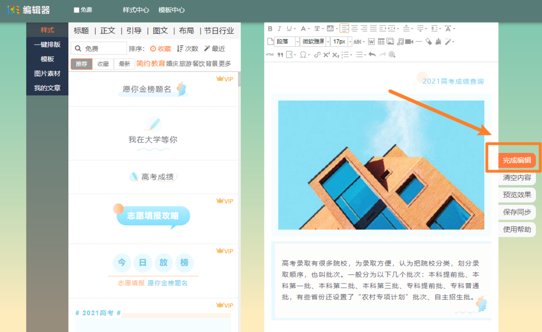 ③ 在圖文編輯界面為你的文章任意添加圖文樣式或模板,完成排版后,點(diǎn)擊【完成編輯】按鈕,回到SVG編輯器