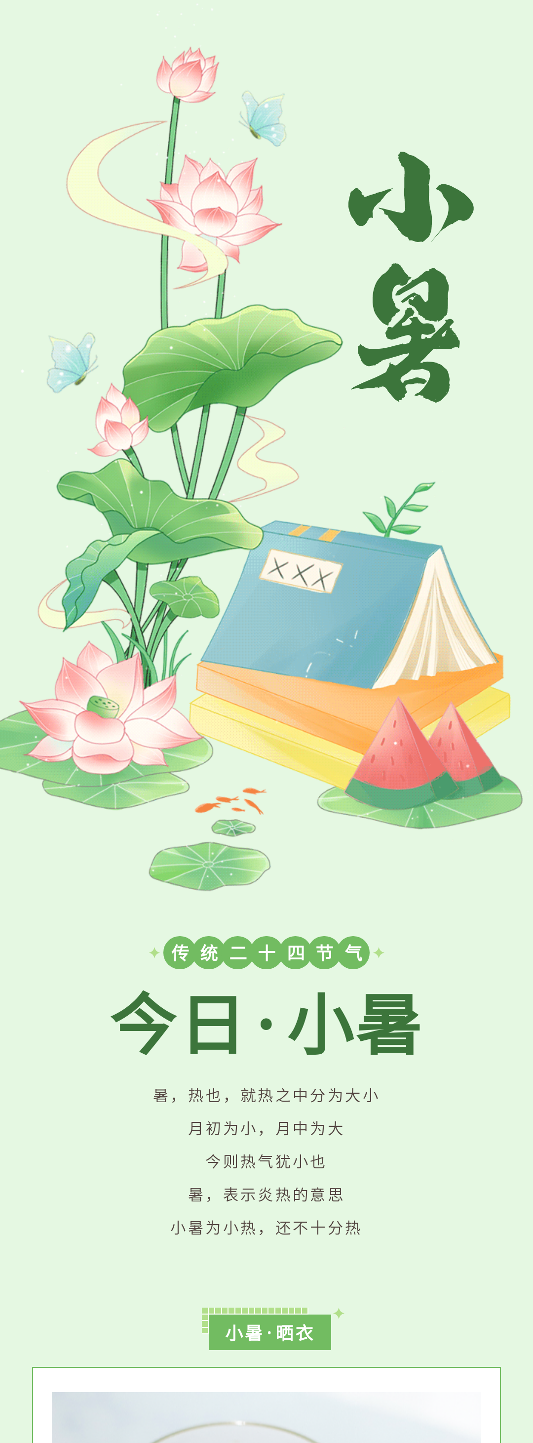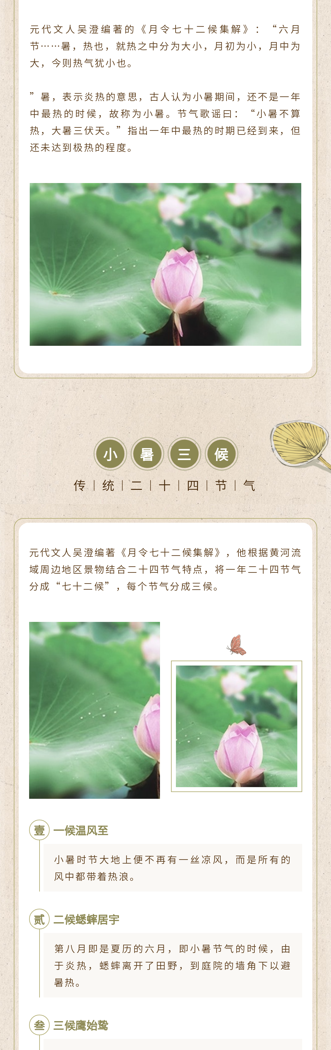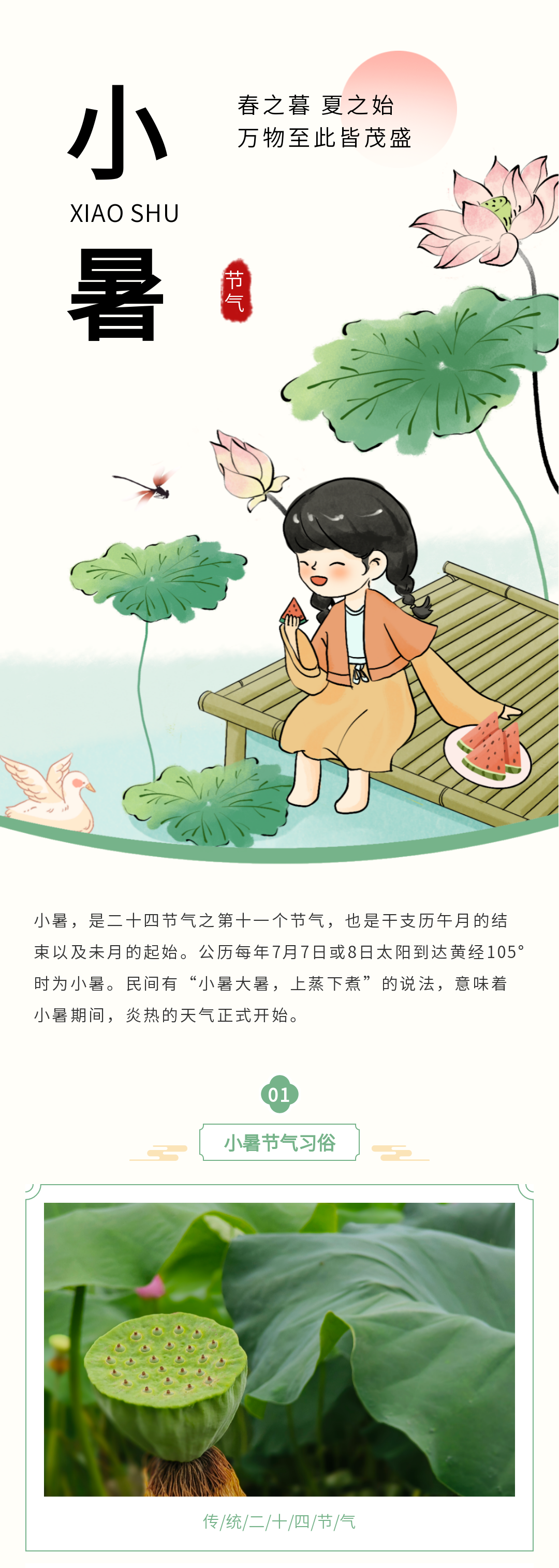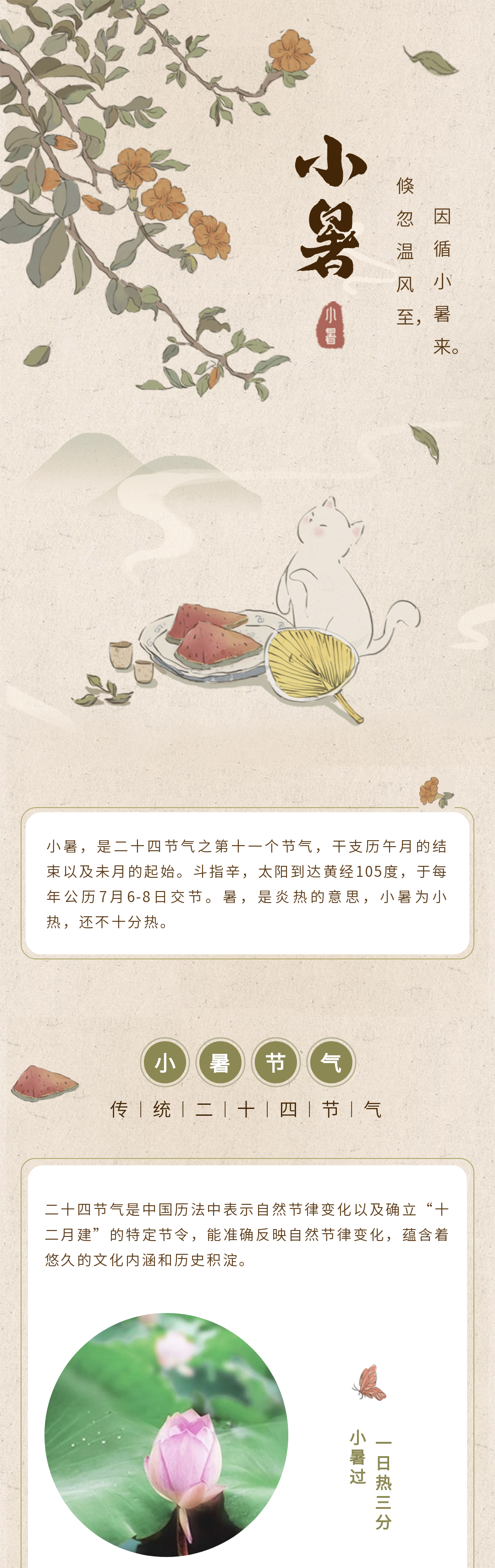 小暑,是二十四節(jié)氣之第十一個節(jié)氣,干支歷午月的結(jié)束以及未月的起始。暑,是炎熱的意思,小暑為小熱,還不十分熱。民間有“小暑大暑,上蒸下煮”之說。